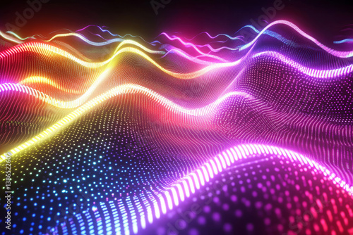 colorful abstract neon light waves with glowing particles