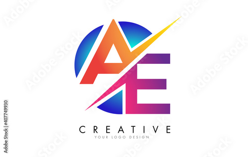 Colorful AE A E Letter Logo Design with a Creative Cut and Gradient Blue Rounded Background.