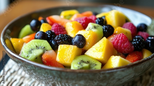 Colorful and Fresh Fruit Salad in a Bowl with Vibrant Citrus, Berries, and Melon Pieces Perfectly Arranged for a Healthy Snack or Dessert Option