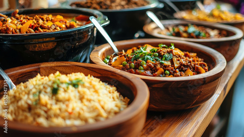 Colorful Array of Delicious Dishes on a Wooden Table Featuring Savory Options for Tasty Meal Gatherings and Celebratory Events with Natural Ingredients