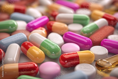 Colorful array of medicines: exploring the world of pharmaceuticals. Bright colors. Assorted medicine: a colorful background of pills, tablets, and capsules. Creative poster. Visual balance.