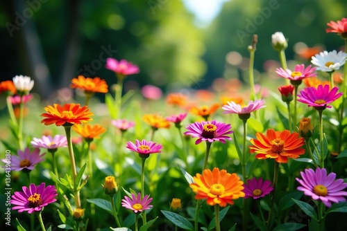 Colorful array of vibrant wildflowers blooming in a lush garden setting, spring, foliage