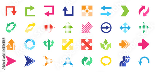 Colorful arrows big icons collection. Arrow symbol. Direction, cursor, pointer sign. Modern design decorative elements for apps, interface, business and project. Flat design. Vector illustration.