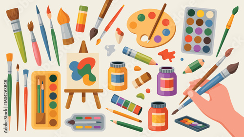 Colorful Art Supplies Flat Vector Illustration Featuring Paint Brushes Paint Tubes Watercolor Palettes Pencils Crayons and an Easel with