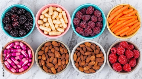 Colorful Assortment of Healthy Snacks and Colorful Candies in Bowls on a Marble Surface