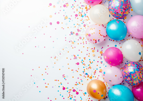 colorful balloons and confetti for a holiday celebration like birthday anniversary, wallpaper background for ads or gifts wrap and web design, white blank wall
