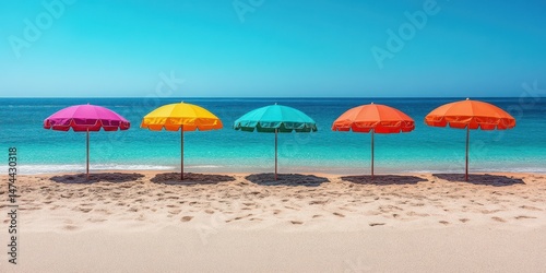 Colorful beach umbrellas line the sandy shore under a clear blue sky on a sunny day