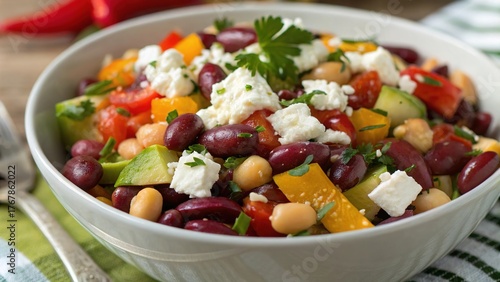 Colorful bean salad garnished with feta cheese ready to be enjoyed on a sunny day
