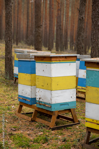 Colorful beehives in a pine forest. Beekeeping in spring and fall. Several wooden beehives, painted blue, yellow, and white, stand among tall, straight pine trees. Beekeeping, organic honey production