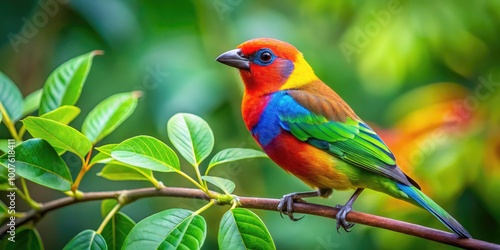 Colorful Bird Perched on a Branch Surrounded by Green Leaves in a Serene Natural Environment