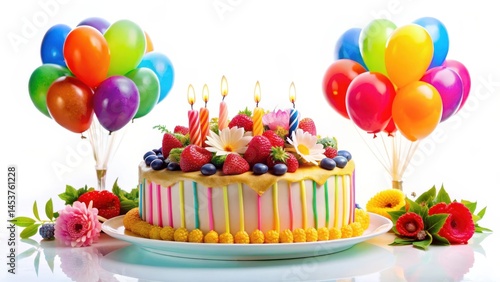 Colorful birthday cake with candles isolated on white background, decorated with flowers and berries, surrounded by a circle of colorful balloons, celebratory, holiday decor