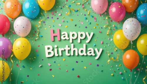 Colorful birthday scene featuring balloons and confetti with a cheerful "Happy Birthday" message on a vibrant green background.