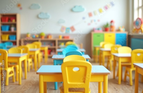 Colorful blurred kindergarten class, school background with desks and chairs. Yellow and blue furniture, toys, decorations on wall. Background showcases childhood education, joyful ambiance.