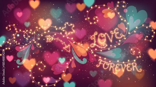 Colorful bokeh hearts and glowing Love Forever light typography - Valentine background, romantic celebration, magical lights, bokeh patterns, fairy lights, love concept