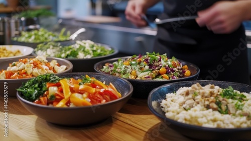 Colorful bowls of fresh salads and grains prepared in a modern kitchen, showcasing healthy eating