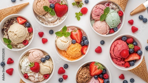 Colorful bright ice cream in bowls with waffle cones and berries, variety of ice cream flavors with fresh berries top view.