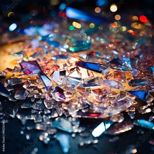 Colorful broken glass pieces on a reflective surface with blurred lights in the background