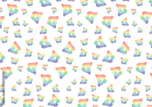 Colorful butterfly pattern with rainbow hues on a white background, seamless design perfect for textiles and tiles, featuring vibrant and lively butterflies