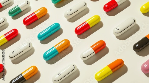 Colorful capsules aligned in a grid pattern on neutral background