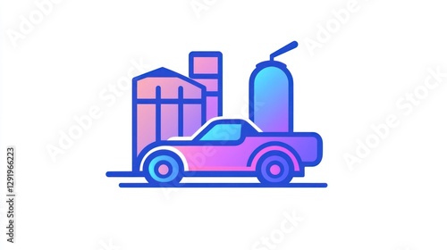 Colorful car with city buildings and gas tank. Stock photo for illustrations, transportation, and cityscape themes