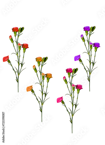 Colorful carnation flowers on twigs on isolated transparent background