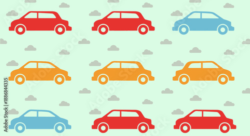 Colorful cars arranged in a pattern on a light green background with clouds.
