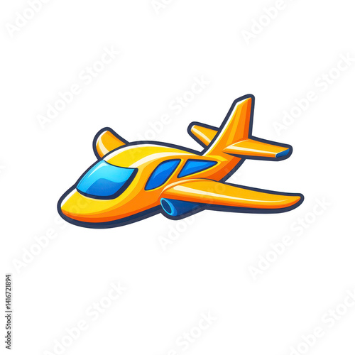 colorful cartoon airplane with sleek design and vibrant colors, featuring blue cockpit and yellow body, flying through air. playful style adds sense of fun and adventure