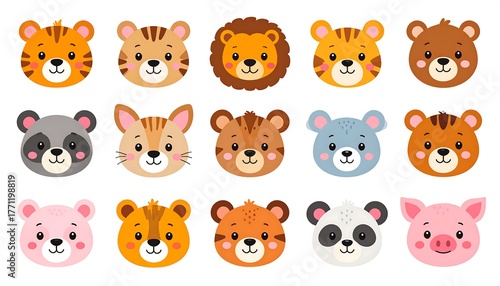 Colorful cartoon animal faces in a cheerful, symmetrical arrangement