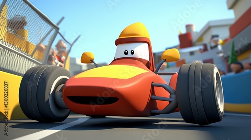 Colorful Cartoon Race Car Participating in an Animated Race on a Sunny Day in a Bustling City Environment