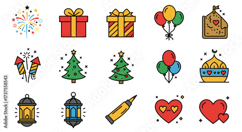 Colorful Celebration and Holiday Filled Line Icon Set.