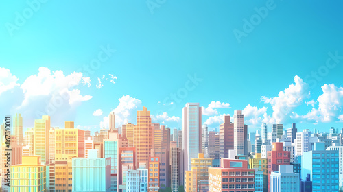 Colorful city skyline with tall buildings