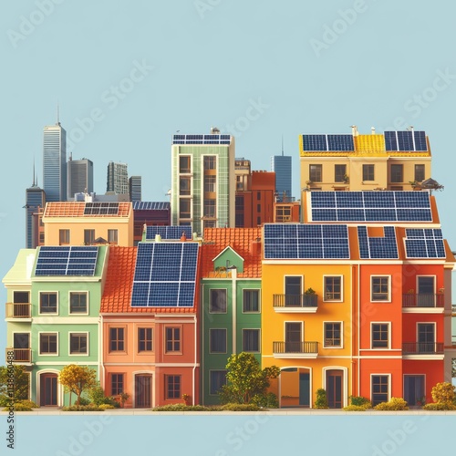 Colorful cityscape featuring eco-friendly homes with solar panels on rooftops, blending urban and green living.