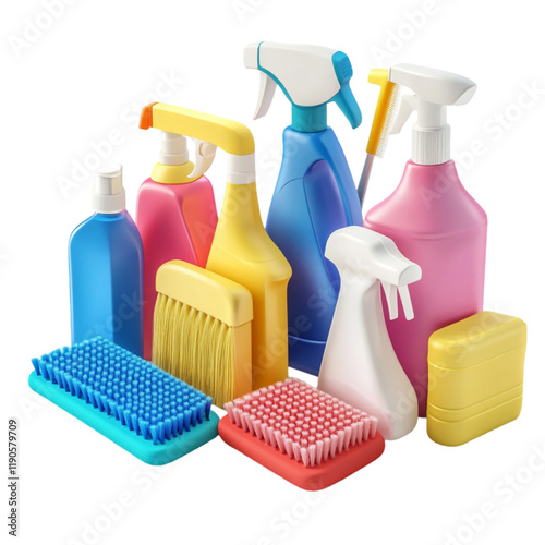Colorful Cleaning Supplies Arrangement: A vibrant collection of cleaning products, including spray bottles, brushes, and a soap container, showcasing a cheerful and efficient cleaning theme.