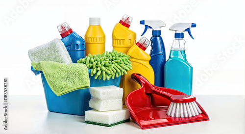Colorful Cleaning Supplies Set with Sponges, Towels, and Spray Bottles on White Background. Cleaning,Cleanliness and Hygiene Concept, Cleaning Service.