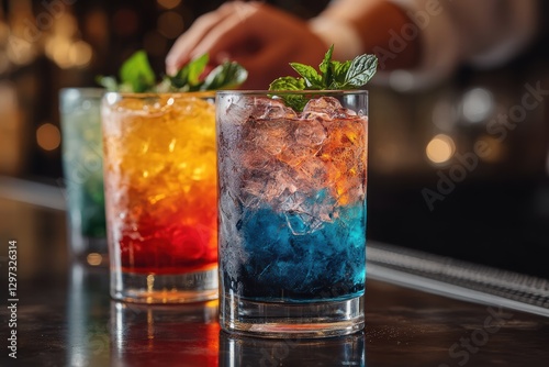 Colorful cocktails served at an elegant bar during a lively evening gathering
