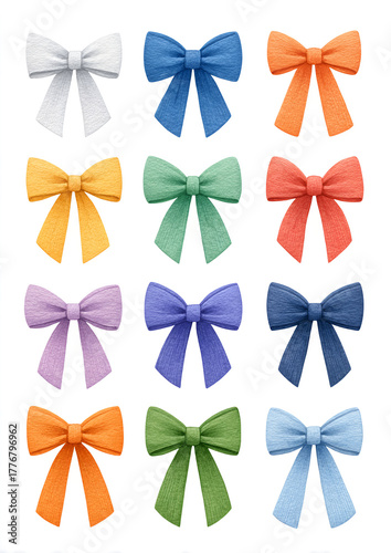 Colorful collection of fabric bows arranged in a grid for crafting and decorating purposes. Coquette aesthetic illustration.