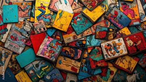 Colorful comic book covers scattered on a surface, showcasing superheroes.