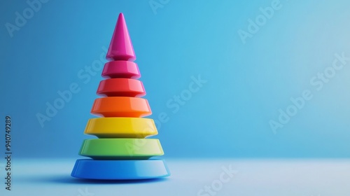 Colorful cone shaped toy with rainbow colors against a blue background.