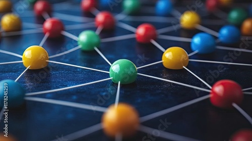 Colorful connected spheres on blue background for network, social media, tech concepts