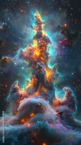 Colorful cosmic nebula towers above vibrant starry background in deep space