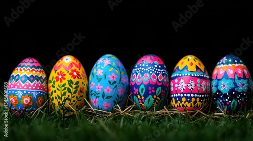 Colorful Decorative Easter Eggs Arranged on Green Grass with Dark Background for Celebration