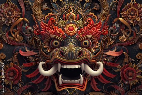 Colorful detailed ornate Balinese demon mask geometric frame.