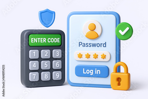 Colorful digital security elements with a password screen and keypad, symbolizing online safety and privacy.