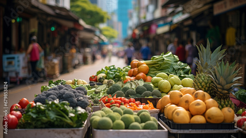 Colorful Display of Bountiful Agricultural Vegetables and Abundant Organic Fresh Fruits at an Outdoor Market. Generative AI.