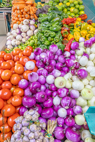 Colorful display of fresh vegetables at the Otavalo market, one of the largest and most traditional markets in Ecuador.