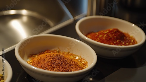 Colorful Display of Various Spices in White Bowls on Kitchen Counter