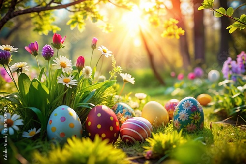 Colorful Easter Egg Hunt in a Lush Garden Setting with Vibrant Eggs Hidden Among Flowers and Grass, Perfect for Spring Celebrations and Family Gatherings