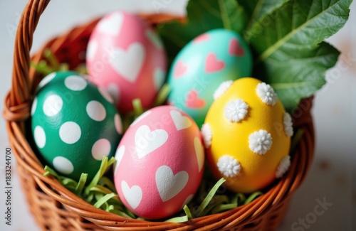 Colorful Easter eggs sit in a wicker basket with heart patterns and dots