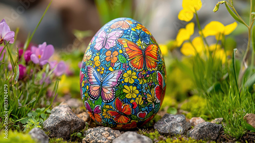 Colorful egg with butterfly and floral patterns placed in vibrant spring garden