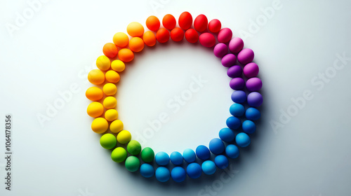 Colorful eggs arranged in a circular gradient create a vibrant pattern. Concept: color harmony and symmetry.